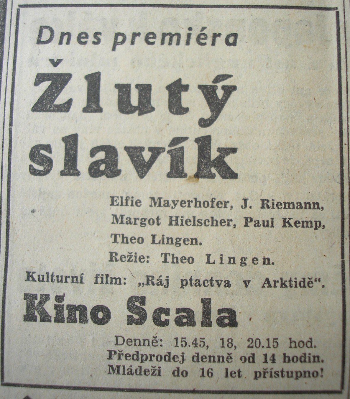| Programme Description (DE) | Kulturfilm: Vogelparadies in der Arktis. Kartenvorverkauf ab 14 Uhr.: Brünner Abendblatt | 1944-06-22 | 100 | |
