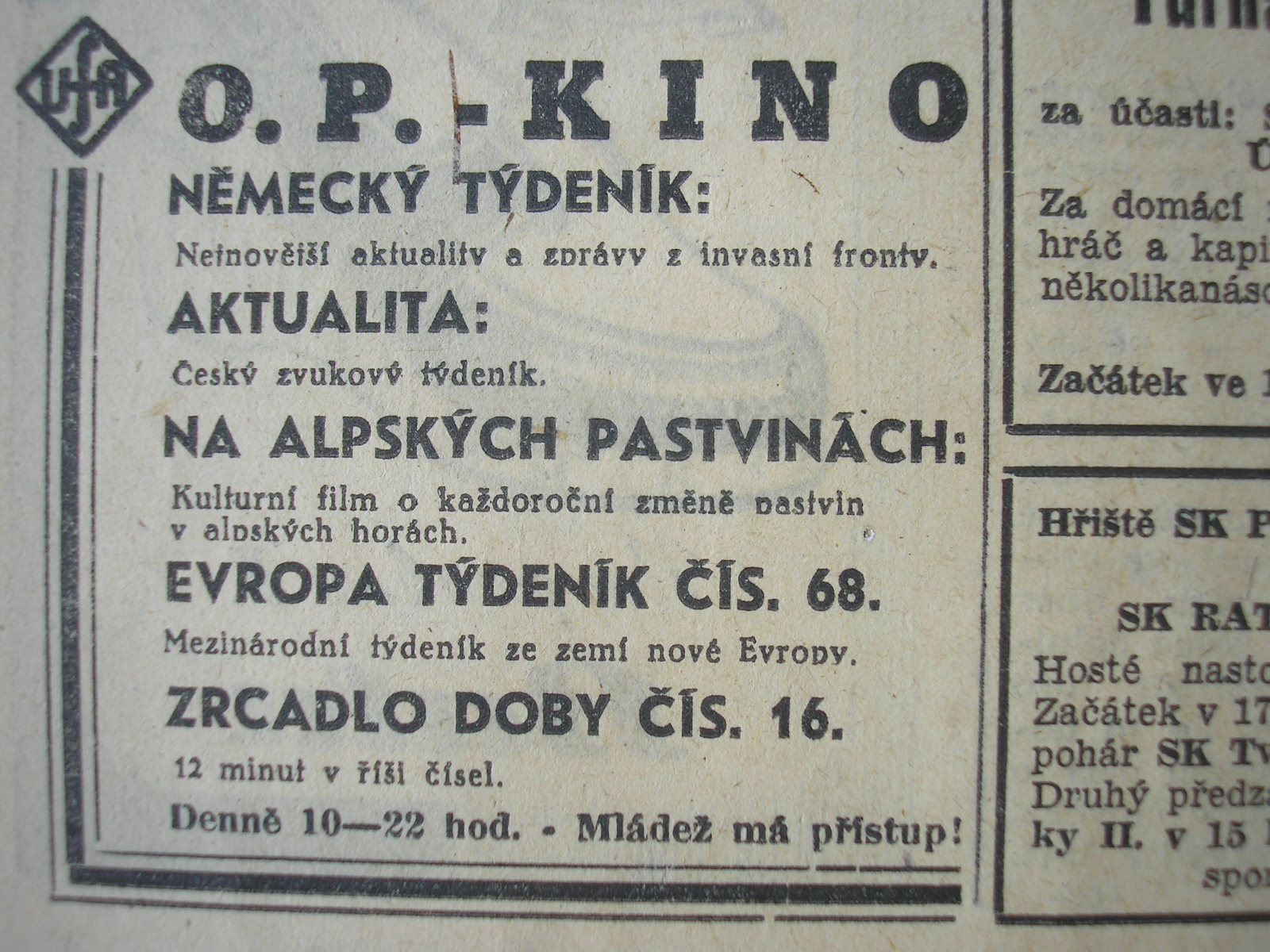 1. Deutsche Wochenschau. Die neuesten Aktualitäten und Frontbildberichte. 2. Aktualita. Tschechische Ton-Wochenschau. 3. Weidewechsel über wilde Pässe. Ein Ufa-Kulturfilm über den alljährichen Futtelnplatz-Wechsel in den Alpen. 4. Europa-Woche Nr.68. Internationale Wochenschau aus den Ländern des neuen Europa. 5. Zeitspiegel Nr. 16.12 Minuten Plauderei u. Zahlen. Täglich 10-22 Uhr - Jugendfrei!