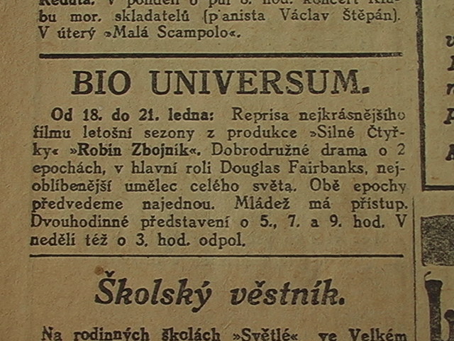 Reprisa. Obě epochy předvedeme najednou. Mládež má přístup. Dvouhodinné představení o 5., 7. a 9. hod. V neděli též o 3. hod. odpol.