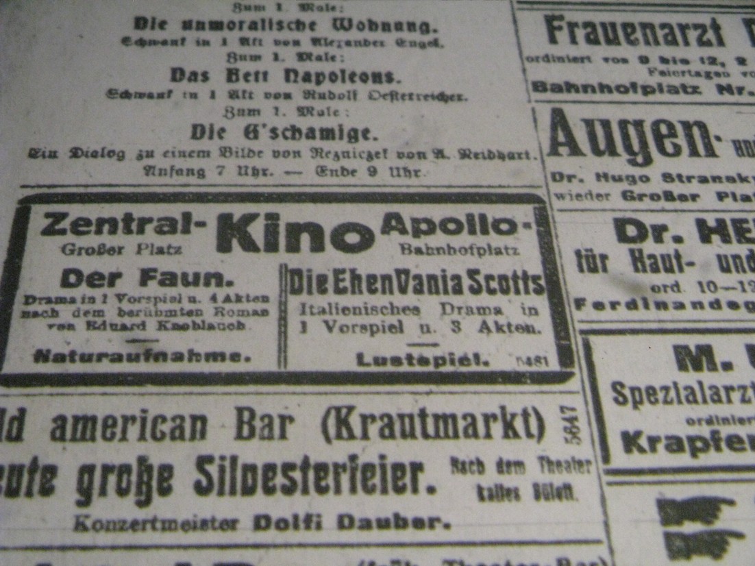 Heute (Silvesterabend) beginnen die Vorstellungen um 1/2 5, 6, 1/2 8, 9 und die lezte Vorstellung ausnahmsweise noch um 10 Uhr.