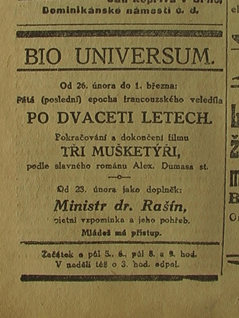 Od 23. února jako doplněk Ministr dr. Rašín, pietní vzpomínka a jeho pohřeb. Začátek o půl 5., 6., půl 8. a 9. hod. V neděli též o 3. hod. odpol.