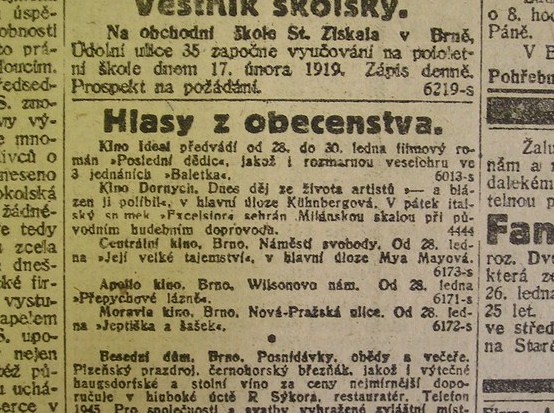 | Cinema | Tagesbote aus Mähren und Schlesien | 1919-01-27 | 100 | |