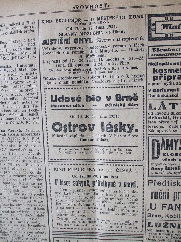 | Cinema | Rovnost | 1924-10-17 | 285 | 100 |