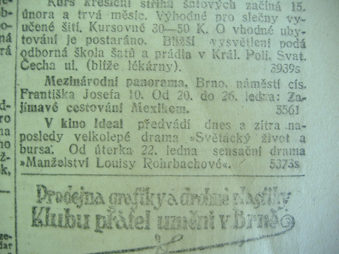 V kino Ideal předvádí dnes a zítra naposledy velkolepé drama "Světácký život a bursa". Od úterka 22. ledna sensační drama "Manželství Louisy Rohrbachové".