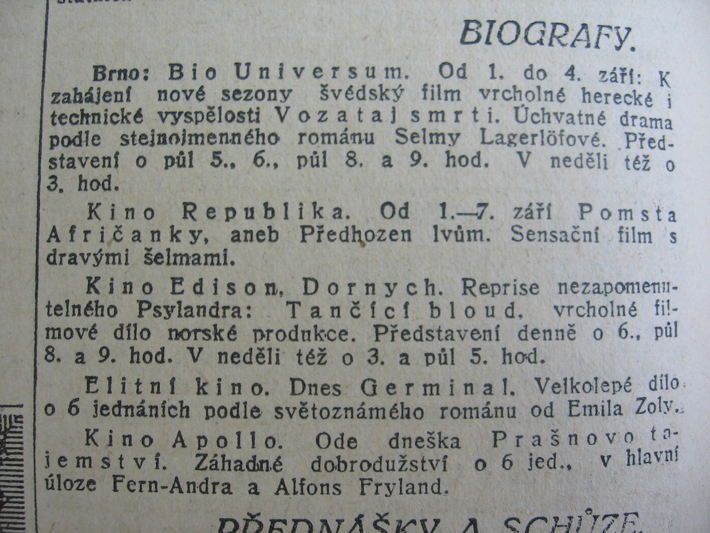| Programme publishing date | 1922-09-01: Lidové noviny | 1922-09-01 | 437 | 100 |