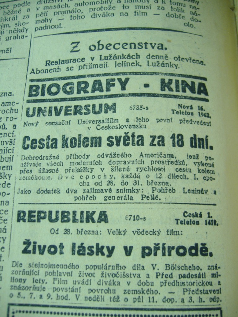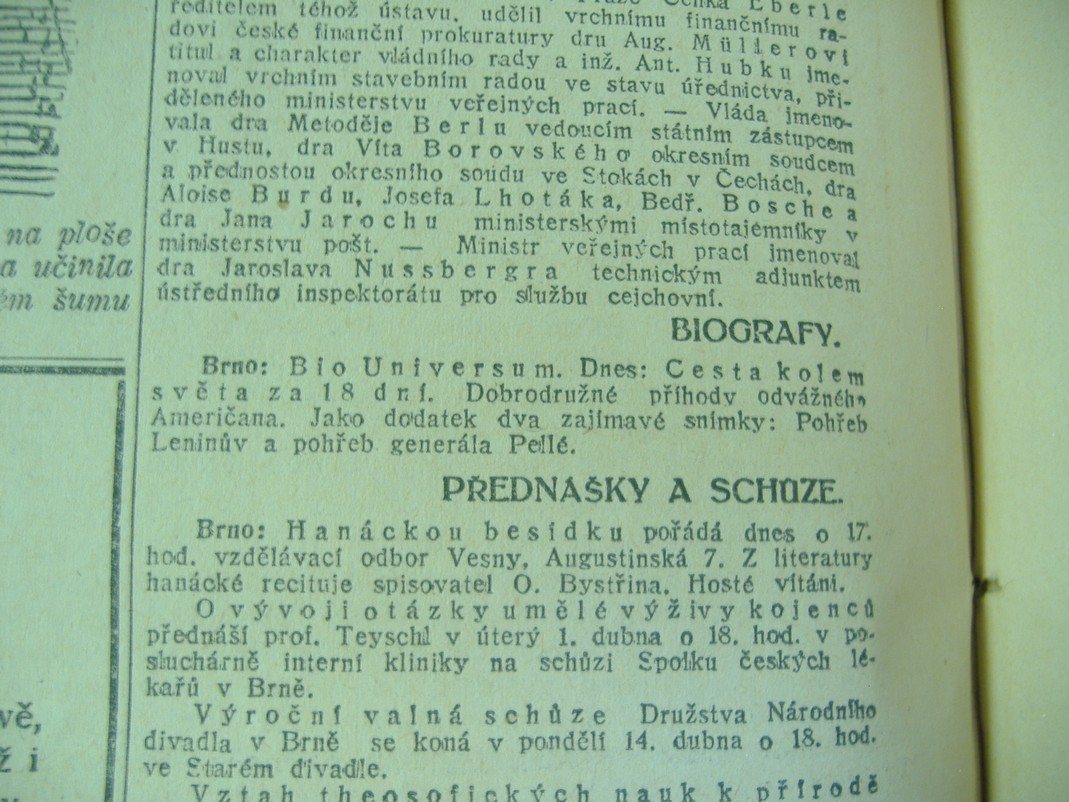 | Programme Description (CZ) | Jako dodatek dva zajímvé snímky: Pohřeb Leninův a Pehřeb generála Pellé.: Lidové noviny | 1924-03-30 | 163 | 100 |