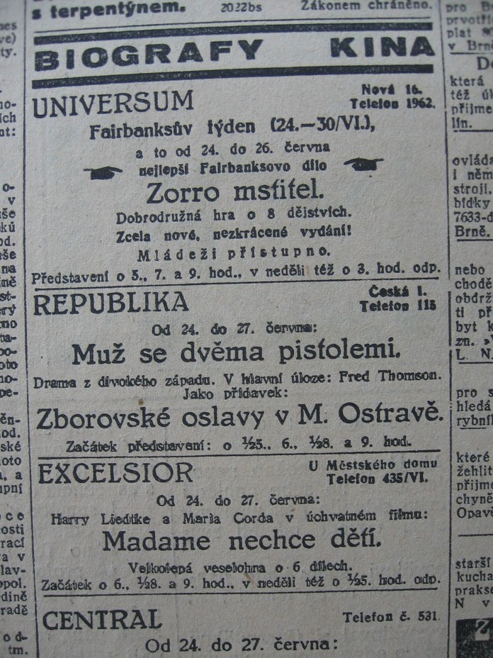 Jako přídavek: Zborovské oslavy v Mor. Ostravě. Začátek představení o půl 5., 6., půl 8. a 9. hod.