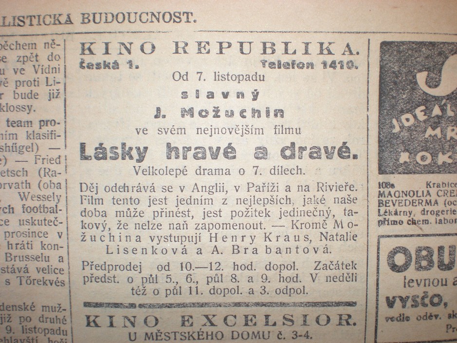 | Programme Description (CZ) | Kino Republika pro velký úspěch prodlužuje film Lásky hravé a dravé s Možuchinem do čtvrtka.: Lidové noviny | 1924-11-11 | 565 | 100 |