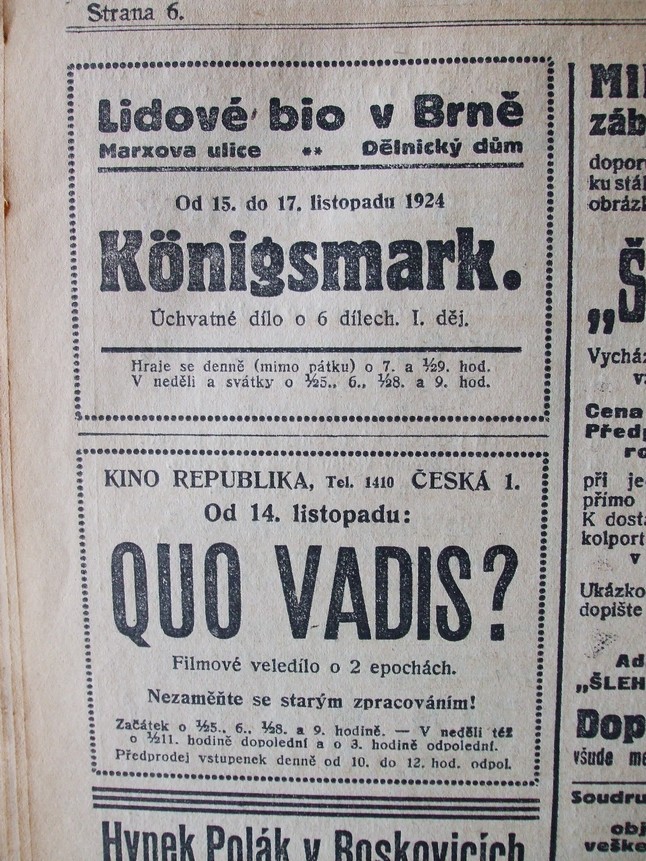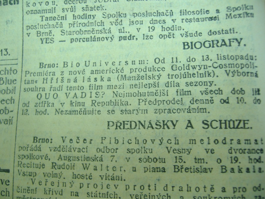 | Programme Description (CZ) | I. epocha: QUO VADIS? předvádí se při zesíleném orkestru ještě do čtvrtka! Představení denně o půl 5., 6., půl 8. a 9. hod. Předprodej lístků na druhou epochu od středy dop. od 10.-12. hod. Zajistěte si lístky v předprodeji.: Lidové noviny | 1924-11-18 | 579 | 100 |