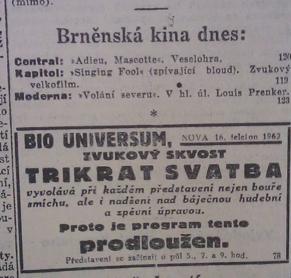 | Programme Description (CZ) | Třetí týden prodlouženo! Začátek o 1/2 5., 7. a 1/4 10 hod. Předprodej vstupenek (i po příští den) denně od 1/2 11 do 1/2 1 hod. a od 3 hod. odpol.: Lidové noviny | 1930-04-01 | 167 | 100 |