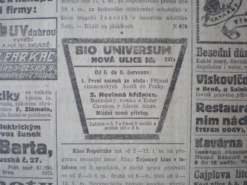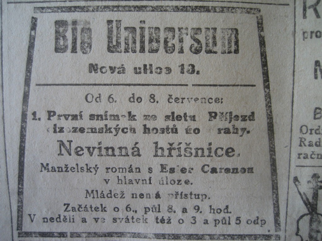 Mládež nemá přístup. Začátek o 6., půl 8. a 9. hod. V neděli též o 3. a půl 5. hod. odpolední.
