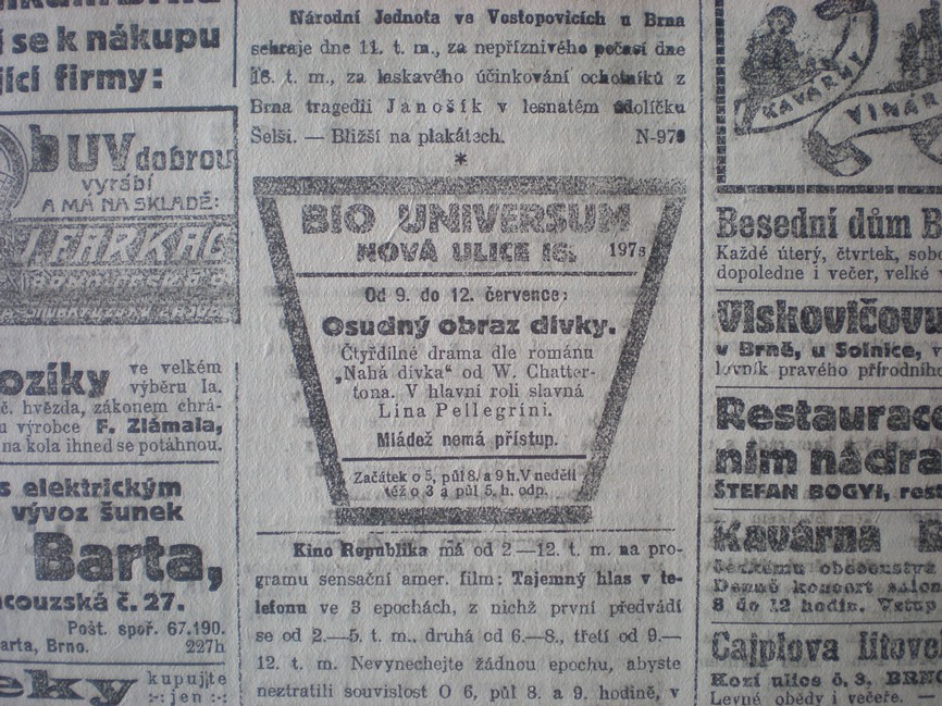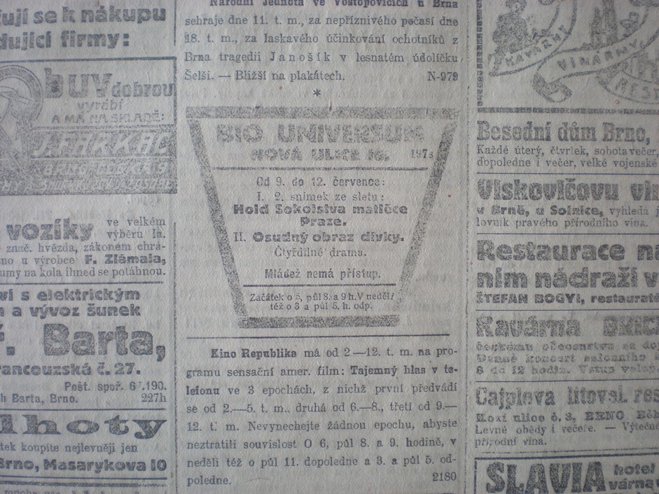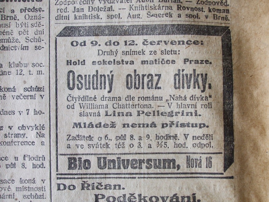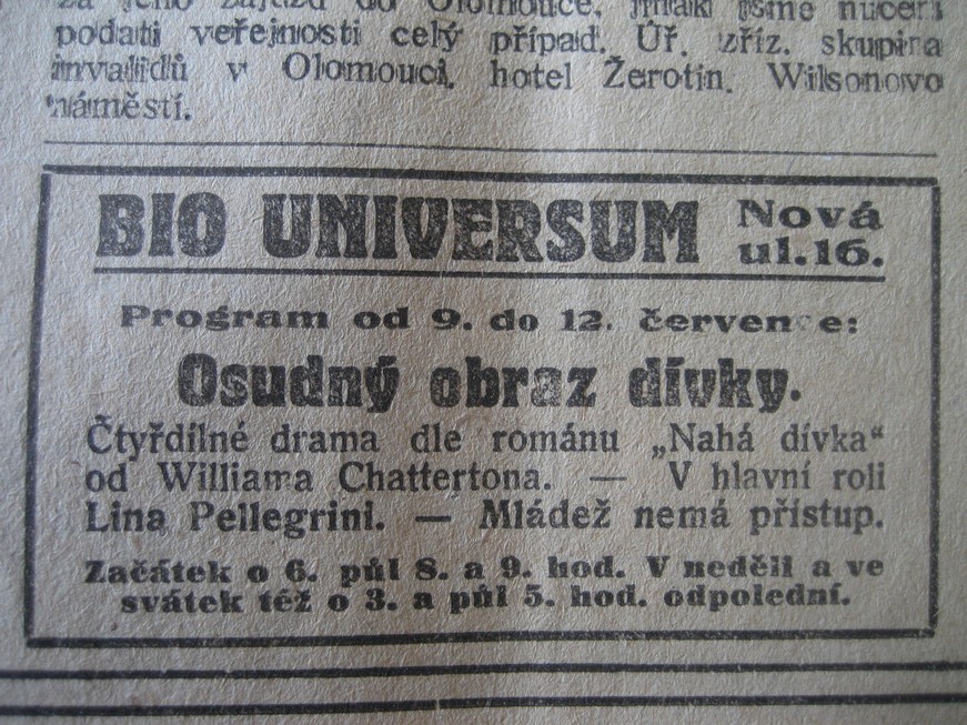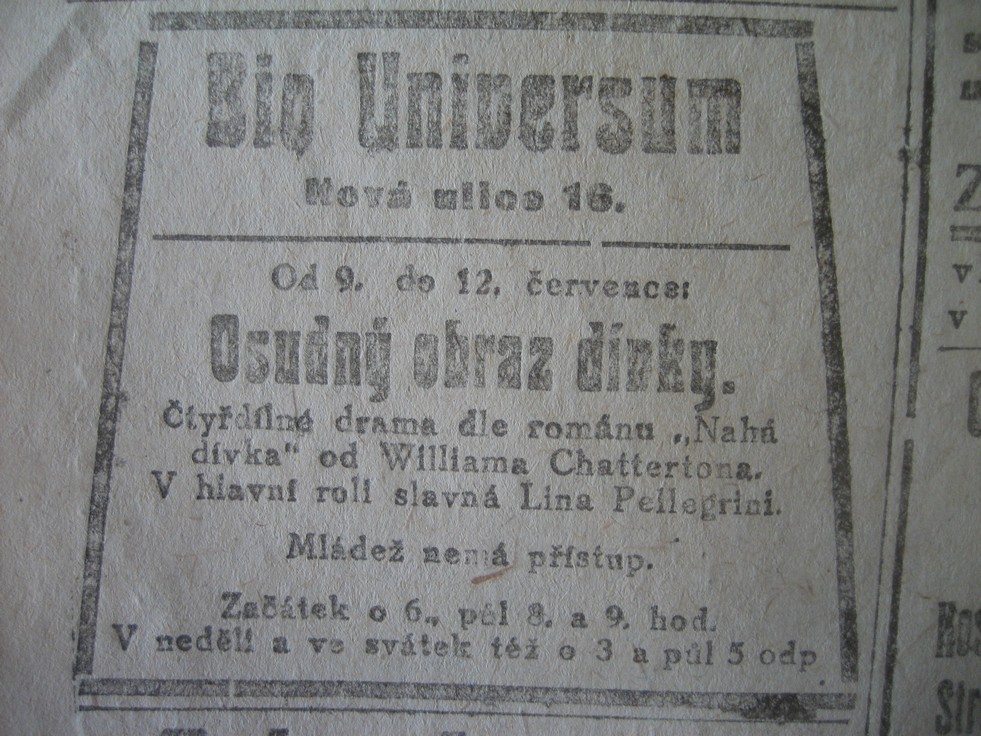 Mládež nemá přístup. Začátek o 6., půl 8. a 9. hod. V neděli též o 3. a půl 5. hod. odpol.