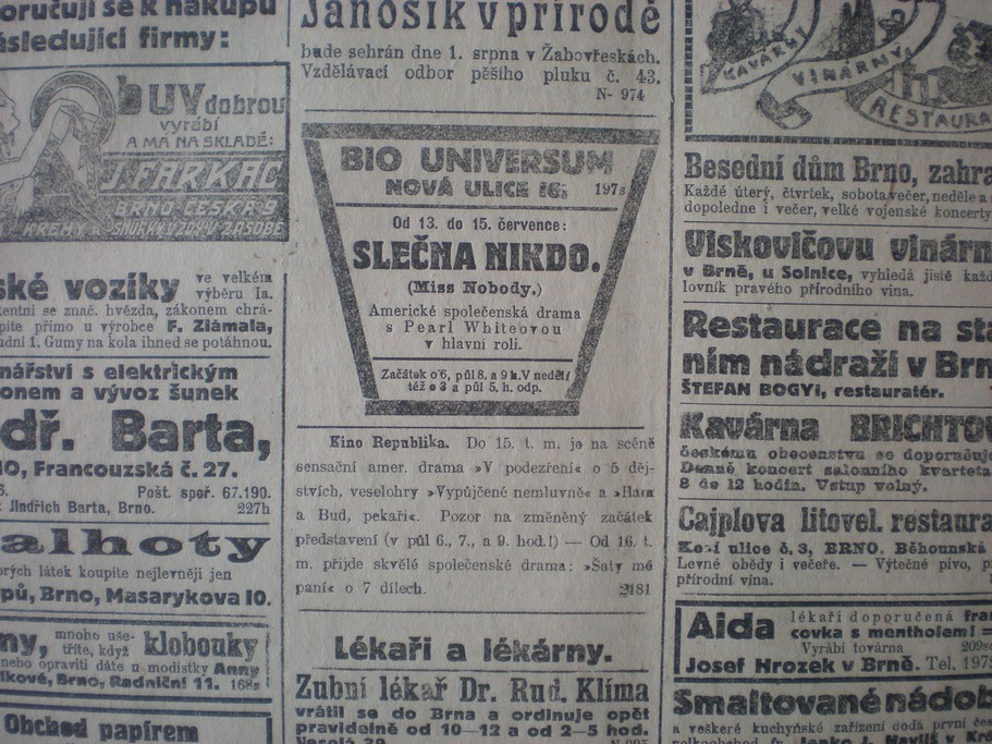 | Programme Description (CZ) | V úterý 13. července nový program. Filmy pouze americké produkce.: Lidové noviny | 1920-07-09 | 334 | 100 |