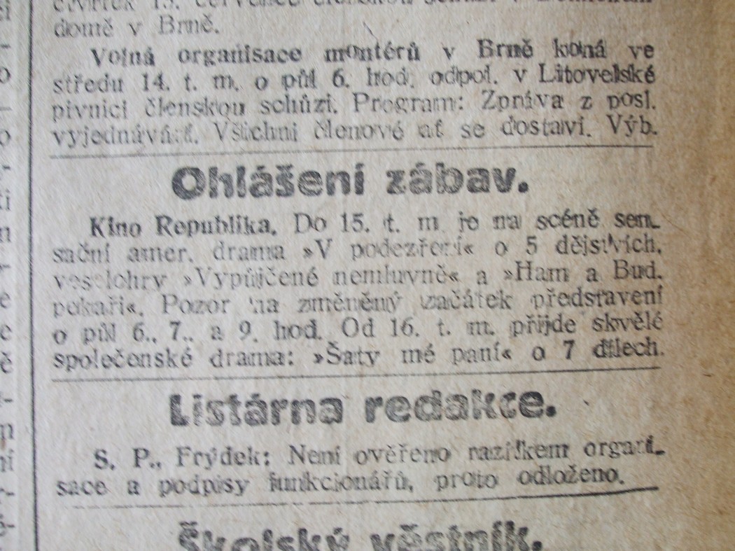 | Programme Description (CZ) | Pozor na změněný začátek představení. O půl 6., 7. a 9. hod.: Lidové noviny | 1920-07-13 | 341 | 100 |
