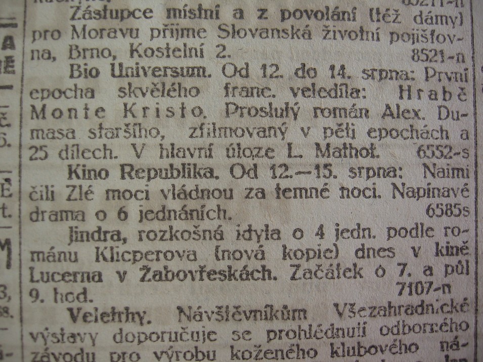 | Programme Description (CZ) | Dnes. O 7. a půl 9. hod. Nová kopie.: Lidové noviny | 1921-08-14 | 405 | 100 |