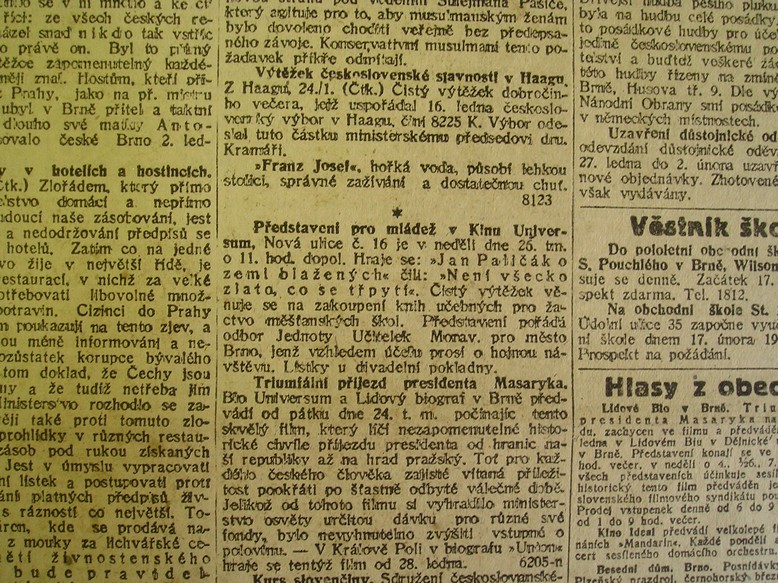 Čistý výtěžek věnuje se na zakoupení knih učebných pro žactvo měšťanských škol. Představení pořádá odbor J. U. M. pro město Brno, jenž vzhledem k účelu prosí o hojnou účast. Lístky u divadelní pokladny.