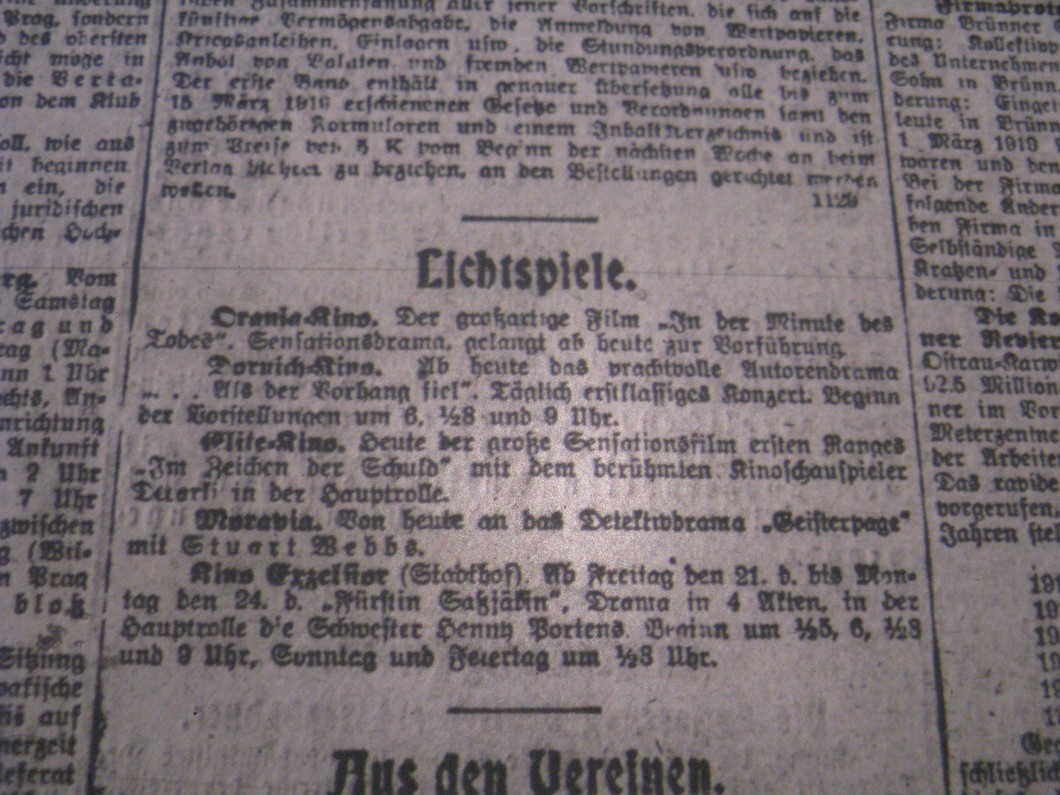 | Programme Description (DE) | Infolge des ungewöhnlichen Erfolges wurde der grossartige Kriminalfilm bis Donnerstag prolongiert: Tagesbote aus Mähren und Schlesien | 1919-03-25 | 141 | 100 |